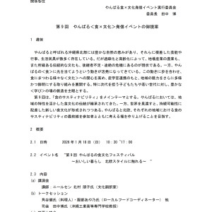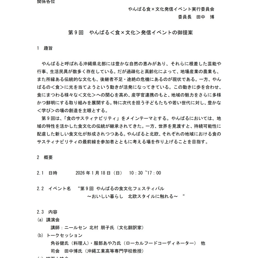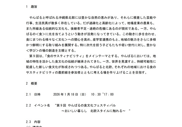 第9回 やんばる<食×文化>発信イベントの企画案 【趣旨】 やんばると呼ばれる沖縄県北部には豊かな自然の恵みがあり、それらに根差...